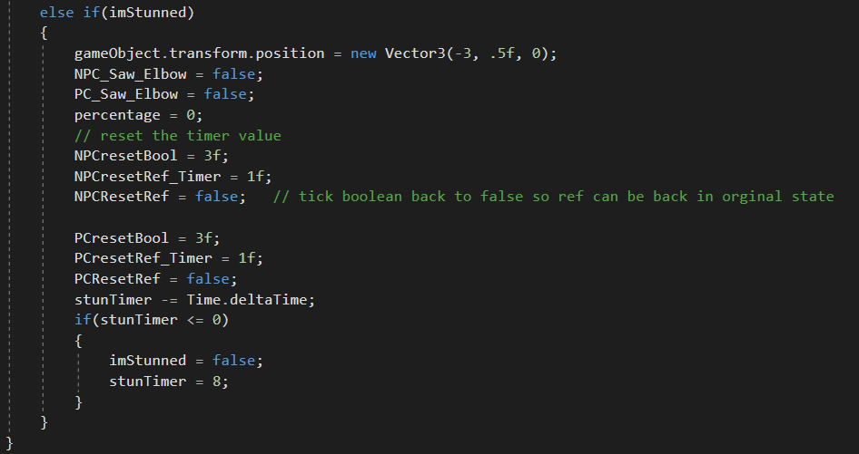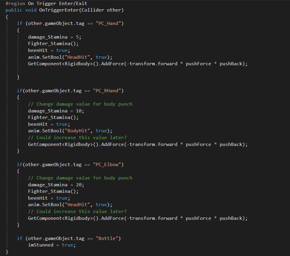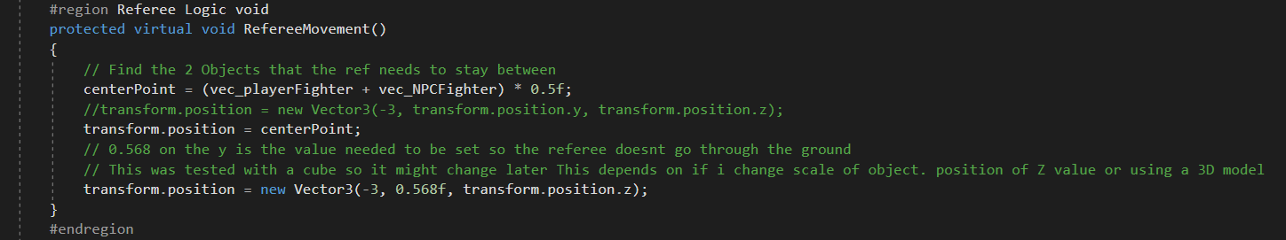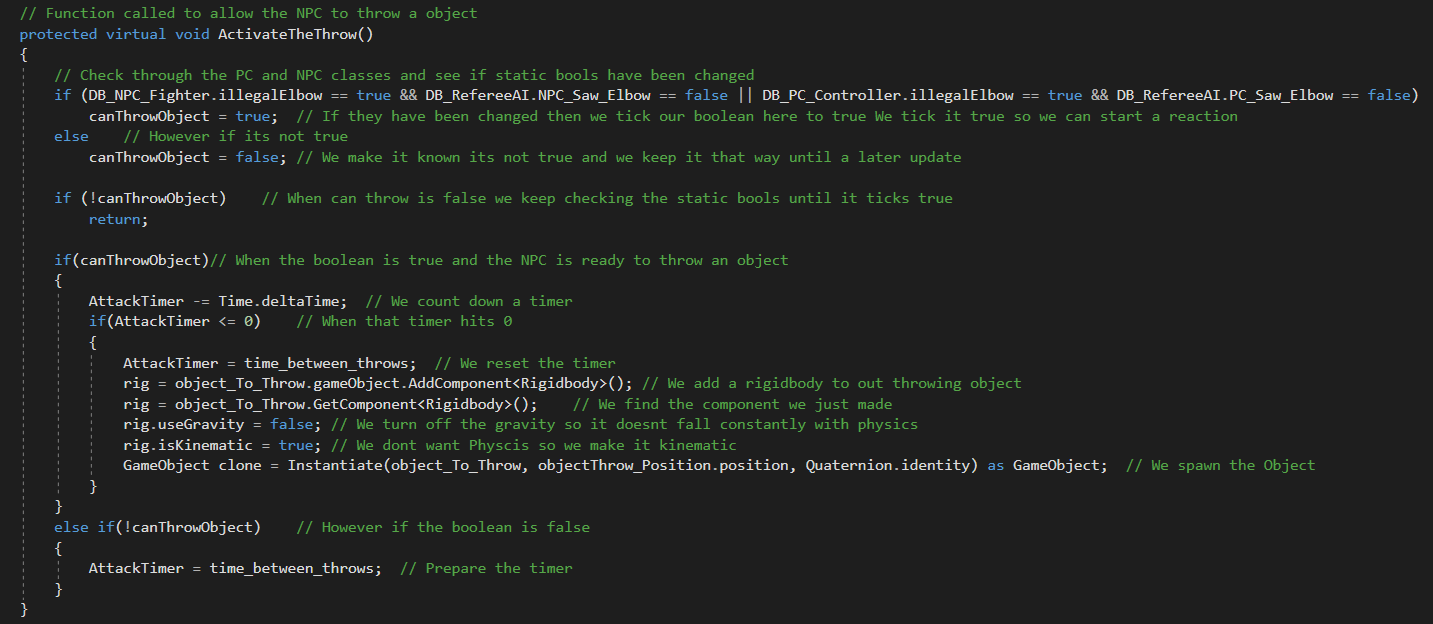 However, like most projects there are some things I would have liked to have done better if time was on my side. To start I would have liked to make the environment more interesting by designing the level instead of using placeholder objects like cubes used for the ring, referee and AI crowd member. I would have also liked to spend a little more time on the animations for both the player and NPC so they could play more smoothly, whether it is in blend tress or when & where they’re called through the scripts. Lastly, I would have liked to have spent more time on the AI thrower so there could be more dynamic throws. This would have allowed fighters to punch the object at their opponent or allowed for more combat options, like head butts and blocking attacks for a more strategic approach to the gameplay.