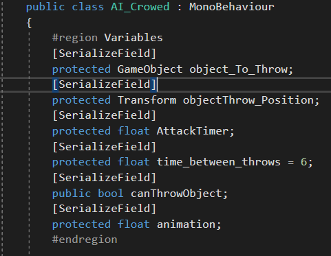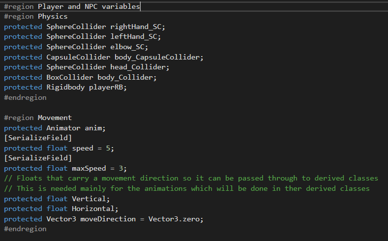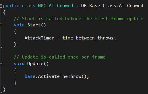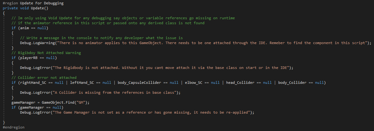 This is the Base class which controls a lot of the logic for the game. This C# script gets passed into other classes so they can use the functions which have been declared in the base. There are also subclasses in the base which are used by the camera or referee to stop errors from appearing in the console.