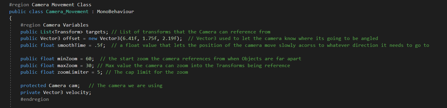 This script is applied to the camera so that it will follow a list of objects and find the centre point between them all. It also has a zoom effect when objects move closer or further away from each other.