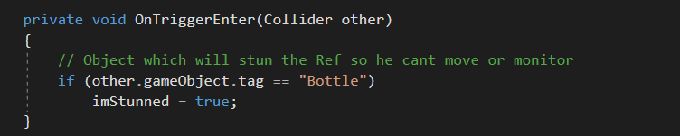 This derived class allow for different types of gameplay. The referee AI will be stunned and when sending each fighter into their corner, the referee is prevented as they have been stunned. When the referee is stunned, players can use more aggresive moves without being penalized. While the referee can be stunned so can the fighters when the bottle is thrown at them. The bottle gets thrown at the fighters when they use an illegal fighting technique.