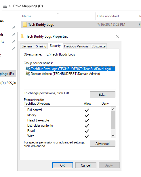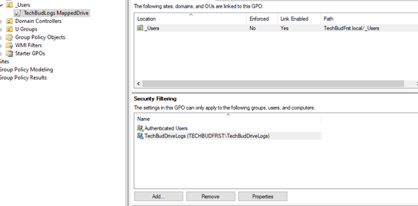 When it was made, I made sure to add the group I made to the security filtering. This way the Policy applies only to the specific groups. In this case I have a user who has been assigned the group TechBudDriveLogs.